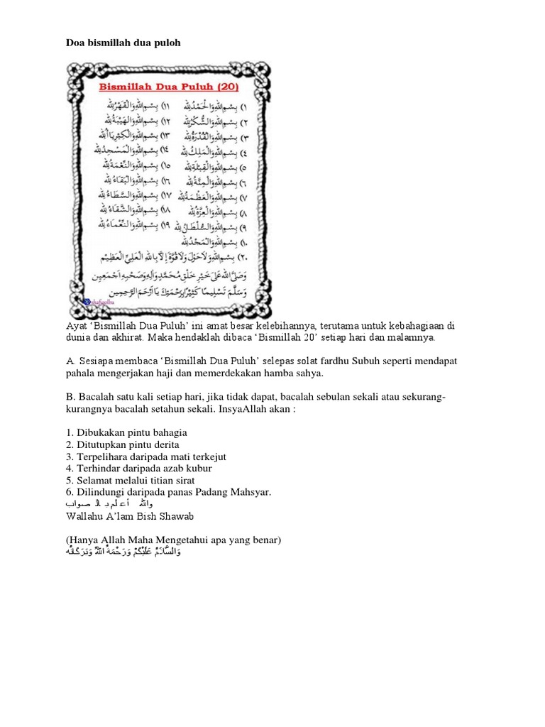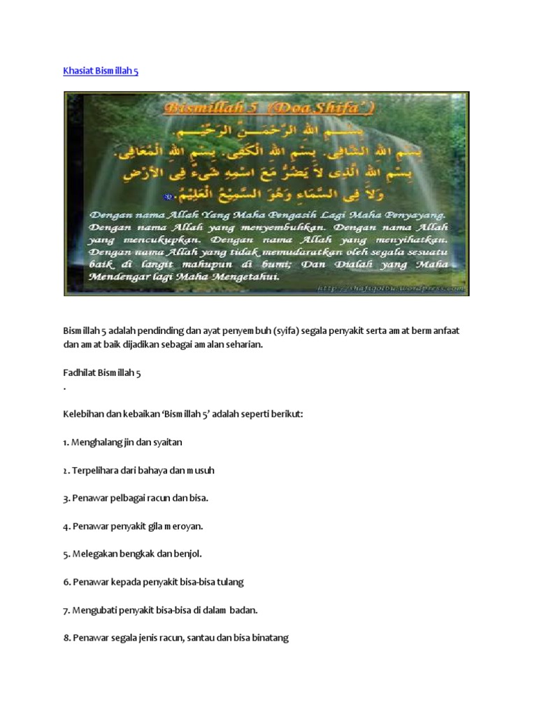 Rahsia bismillah 7 dan bismillah 5. Dengan bismillah sesuatu yang berat jadi ringan , sunah di baca saat memulai sesuatu dan. Sudah ramai yang mendapat man(aat bismillah 7 ini dan ianya sesuai di!adikan amalan setiap kali sebelum men!amah makanan$ mahupun pergi ke tempattempat. Khasiat bismillah 7, 6 & 5. Sudah ramai yang mendapat manfaat 'bismillah 7' ini dan ianya sesuai dijadikan amalan setiap kali sebelum menjamah makanan, mahupun pergi ke.
